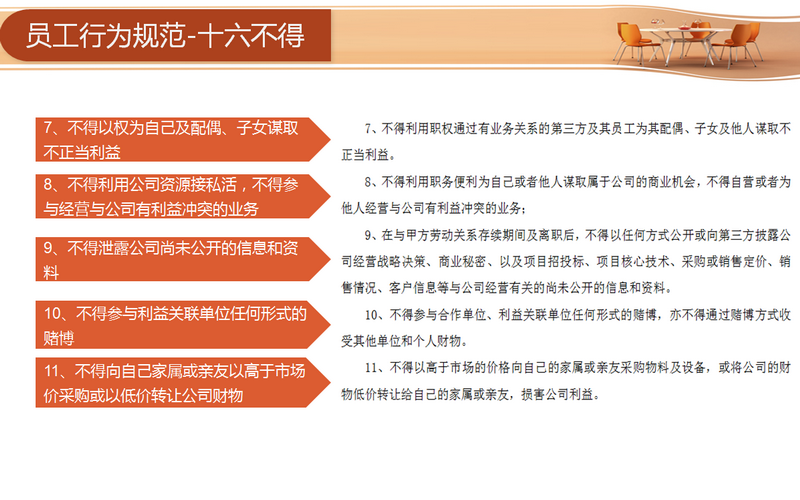 宣講環(huán)節(jié)主要從四個方面著手:分別為“目的、行為規(guī)范約定、違約責任與管理和連帶責任”。員工需要從十六方面規(guī)范自身的行為,包括不得索要和接受第三方財物、不得要求第三方報銷個人費用和要求第三方借款、未經(jīng)允許不得參加第三方安排的宴請等等。